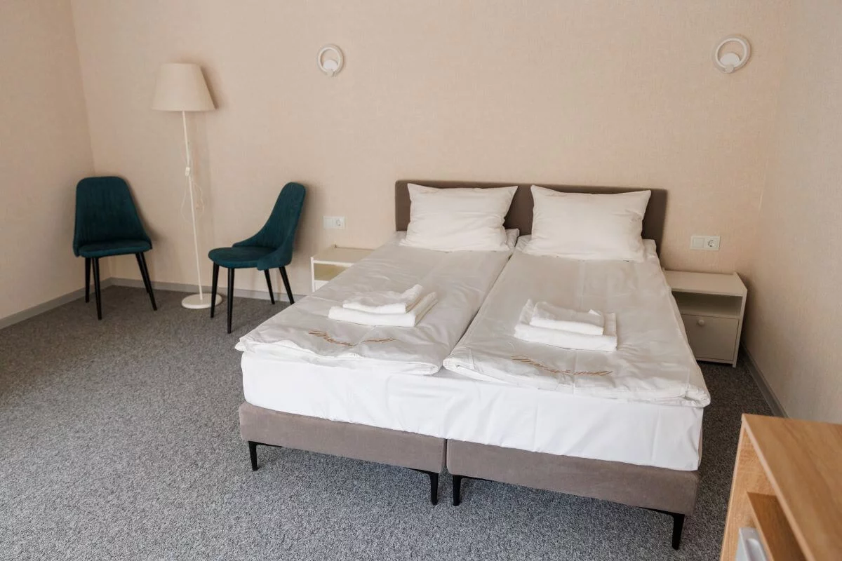 1 двуспальную или 2 односпальные кровати с ортопедическим матрасом, доп. место – раскладной диван